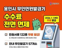 뉴스팍 배상미 기자 | 용인특례시는 2026년 1월 1일부터 지역 내 설치된 무인민원발급기에서 발급되는 민원서류 수수료를 전면 면제한다고 25일 밝혔다. 이번 조치는 ‘용인시 제증명 등의 수수료 징수 조례’ 일부를 개정해 시민들의 행정 서비스 이용 부담을 줄이기 위해 마련됐다. 이에 따라 2026년부터 지역 내 무인민원발급기에서는 주민등록등·초본, 가족관계서류, 토지·건축 관련 서류 등 총 122종의 민원서류를 무료로 발급받을 수 있다. 다만, 법원 소관 사무인 부동산등기사항증명서는 면제 대상에서 제외된다. 현재 시는 시청과 구청, 읍·면·동 행정복지센터를 비롯해 병원, 은행 등 다중이용시설에 총 57대의 무인민원발급기를 운영하고 있다. 이상일 시장은 “이번 수수료 전면 면제로 시민 누구나 시간과 비용의 제약 없이 무인민원발급기를 이용할 수 있을 것으로 기대한다”며 “앞으로도 시민의 일상에서 체감할 수 있는 편리하고 효율적인 민원환경 조성을 지속적으로 추진하겠다”고 말했다. 한편, 지문 인식이 어려워 무인민원발급기 이용에 불편을 겪는 경우에는 가까운 행정복지센터에서 지문을 재등록하거나