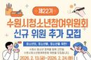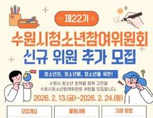 뉴스팍 배상미 기자 | 수원시청소년청년재단(이사장 최종진)은 수원시 청소년의 정책 참여 확대와 권익 증진을 위해 '제22기 수원시청소년참여위원회' 위원을 추가 모집한다고 밝혔다. 수원시청소년참여위원회는 청소년기본법5조의2(청소년자치권의 확대)에 따라 청소년이 직접 정책 제안과 의견 개진에 참여하며 청소년 정책의 실효성을 높이기 위해 운영되는 공식 참여기구이다. 이번 추가 모집은 수원시에 거주하는 9세부터 24세까지의 청소년을 대상으로 하며 총 20명 내외를 선발할 예정이다. 활동 기간은 2026년 3월부터 12월까지이며 주요 활동 내용은 △수원시 청소년 정책 제안‧발굴 및 자문 △정책 관련 전문교육 참여 △청소년축제 기획 및 운영 △경기도 청소년참여위원회 및 관내 참여기구 교류 활동 등이다. 참여위원회 위원에게는 수원시장 명의의 위촉장이 수여되며 활동에 따라 봉사시간도 부여된다. 모집 기간은 2026년 2월 13일부터 2월 24일까지이며 신청은 재단 홈페이지 또는 수원시청소년청년재단 경영지원실로 문의하면 된다.