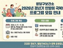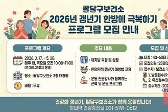뉴스팍 배상미 기자 | 수원시 팔달구보건소가 ‘2026년 갱년기 한방에 극복하기’ 프로그램에 참여할 40~60대 지역 여성을 3월 13일까지 모집한다. 신체적·정신적 변화가 큰 갱년기 시기의 중년 여성들이 변화를 긍정적으로 받아들이고 건강하게 대비하도록 돕는 프로그램이다. 선착순으로 25명을 모집한다. 팔달구보건소 1층 한의약건강증진실에 방문하거나 전화(031-5191-0612)로 신청할 수 있다. 무료 프로그램이다. 프로그램은 3월 17일부터 5월 28일까지 팔달구보건소 3층 대강당에서 진행된다. 주요 내용은 ▲체지방 측정·상담 ▲한의약적 접근을 통한 갱년기의 원인·증상·예방법 교육 ▲운동 전문 강사와 함께하는 근력 및 운동 등이다. 팔달구보건소 관계자는 “급격한 호르몬 변화를 겪는 갱년기 여성들을 위해 알찬 프로그램을 준비했다”고 말했다.