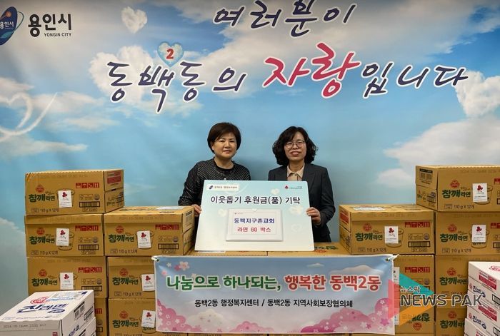 지난 1일 동백지구촌교회는 기흥구 동백2동 행정복지센터를 방문해 80만원 상당의 라면 60박스를 기탁했다. 이날 기탁품은 부활절을 맞이해 교인들이 십시일반 모은 기금으로 마련됐다.