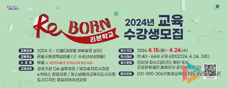 뉴스팍 배상미 기자 | 군포문화재단은 오는 5월부터 군포시평생학습마을에서 운영되는 ‘리본(Re_Born)학교’ 교육 수강생을 모집 중이다.