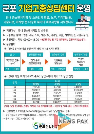 뉴스팍 배상미 기자 | 군포산업진흥원(원장 이석진)은 군포시 소재 중소벤처기업 및 소공인 기업을 대상으로 경영, 기술, 마케팅 등 기업 애로해결을 위한 기업고충상담센터를 상시 운영하고 있다.