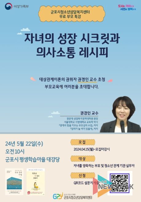 군포시청소년상담복지센터 강연미 센터장은 “부모 자녀 의사소통 전문가이신 권경인 교수님을 초빙하여, 부모님들을 모시고 자녀를 이해하고 올바른 양육 방법에 대해 배울 수 있는 시간이 되기를 기대한다”라고 밝혔다.
