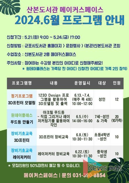 뉴스팍 류은정 기자 | 군포시 산본도서관은 오는 21일부터 메이커스페이스 6월 프로그램 수강생을 모집한다.