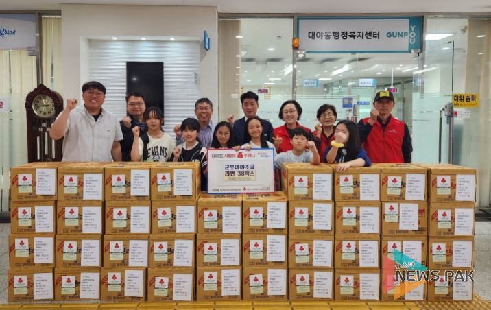 뉴스팍 류은정 기자 | 군포시 대야동에 위치한 군포대야초등학교(교장 김용운) 학생들은 지난 5월 14일 교내 알뜰시장을 개최한 후 발생한 수익금 전액으로 라면 38박스(106만원 상당)를 사서 5월 20일 대야동행정복지센터에 기탁했다.