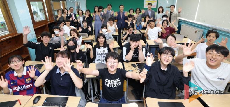 뉴스팍 배상미 기자 | 임태희 경기도교육감이 21일 광수중학교(교장 이정환)를 방문해 수업을 참관하고 “경기교육이 세계에서 가장 훌륭한 인공지능 교수학습 플랫폼을 만들 수 있을 것”이라고 말했다.