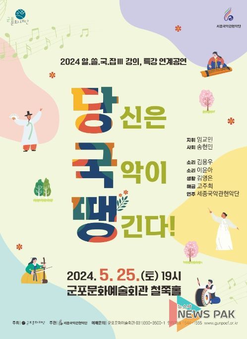 뉴스팍 배상미 기자 | 군포문화재단 상주단체인 세종국악관현악단은 5월 매주 목요일 인문학강좌 '알쓸국잡 : 알아두면 쓸모 있는 국악 잡학 지식'을 진행했다. 이와 연계되는 렉처콘서트 '당국땡 :당신은 지금 국악이 땡긴다'가 5월 25일 토요일 오후 7시, 군포문화예술회관 철쭉홀에서 진행된다.