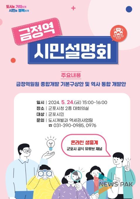 뉴스팍 배상미 기자 | 군포시는 24일 ‘금정역 일원 종합개발 기본구상안 및 역사 통합 개발안’ 사업추진 과정에서부터 시민 참여와 정보를 공유하고 시민의견 개진을 위해 시민설명회를 열어 금정역 일원 기본구상안 및 통합 개발안에 대하여 설명한다.
