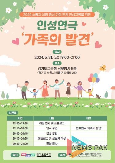 뉴스팍 배상미 기자 | 경기도교육청이 인성교육의 출발점인 가정의 인성교육을 강화하기 위해 ‘인성 연극, 가족의 발견’ 공연을 31일 저녁 7시 남부청사 대강당에서 진행한다.
