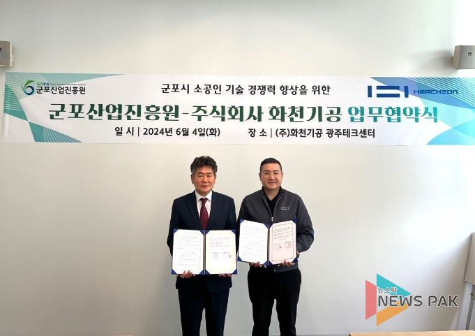 뉴스팍 류은정 기자 | 군포산업진흥원과 화천기공(주)이 6월 4일 광주광역시에 있는 화천기공 광주 테크센터에서 ‘군포시 소공인 제조기술 경쟁력 향상’을 위한 업무협약을 체결했다.
