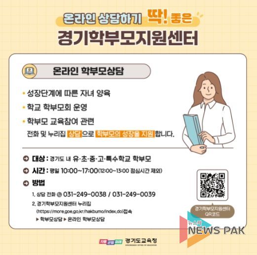 뉴스팍 배상미 기자 | 경기도교육청이 경기학부모지원센터를 중심으로 학부모 상담 지원 체제를 마련했다. 학부모의 자녀 양육, 학교 학부모회 참여 활동 상담으로 학부모의 성장을 지원하기 위한 취지다.