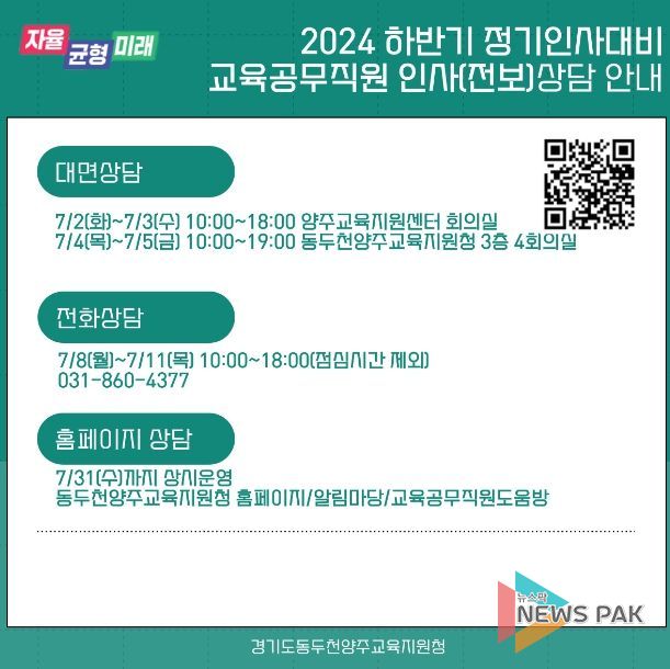 뉴스팍 배상미 기자 | 동두천양주교육지원청은 오는 7월 2일~7월 5일일까지 현장과 소통하는 적극적인 인사 행정 실현을 위해 동두천양주 지역 소속 교육공무직원을 대상으로 인사상담을 진행한다.