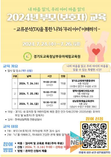 뉴스팍 배상미 기자 | 경기도교육청남부유아체험교육원(원장 허인영)이 오는 24일부터 26일까지 도내 유치원 및 어린이집에 재원중인 만 3~5세 유아 부모(보호자)를 대상으로 부모 교육을 운영한다.