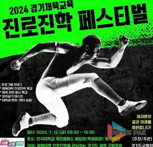 뉴스팍 배상미 기자 | 경기도교육청이 체육에 흥미와 재능을 가진 도내 고등학생을 대상으로 ‘2024 경기체육교육 진로진학 페스티벌’을 오는 12일 단국대학교 죽전캠퍼스에서 개최한다.