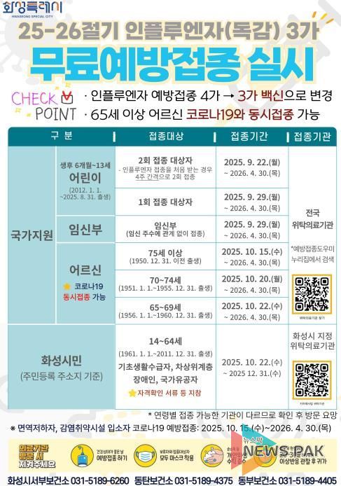 뉴스팍 류은정 기자 | 화성특례시가 오는 22일부터 내년 4월 30일까지 겨울철 인플루엔자(독감) 유행에 대비해 무료 독감 접종을 순차 실시한다고 10일 밝혔다.