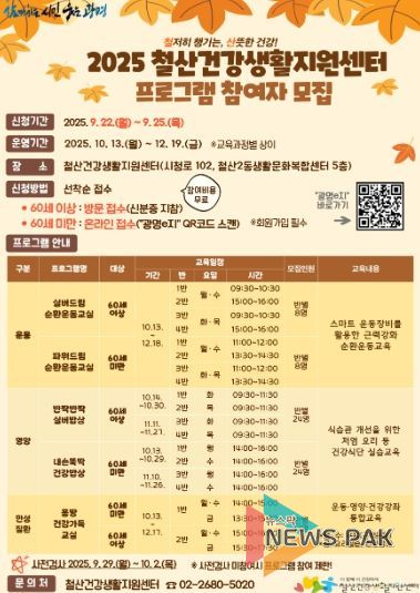 뉴스팍 배상미 기자 | 광명시 철산건강생활지원센터가 오는 22일부터 25일까지 시민을 대상으로 교육 프로그램 참가자를 선착순 모집한다.