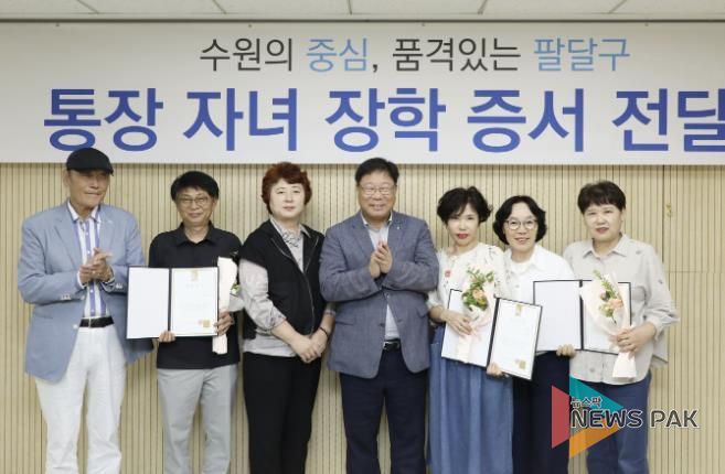뉴스팍 배상미 기자 | 수원시 팔달구는 지난 9월 19일 구청 상황실에서 ‘2025년 하반기 통장자녀 장학증서 전달식’을 통해 관내 통장들의 자녀에게 장학금을 전달했다.