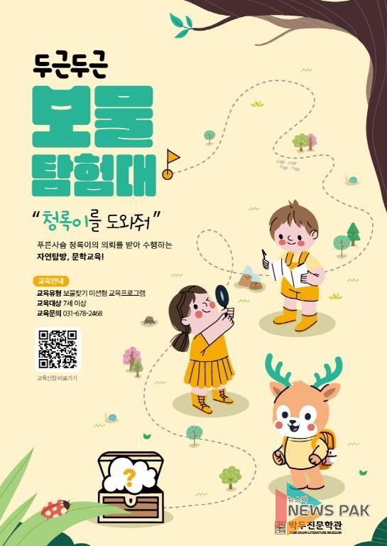 뉴스팍 배상미 기자 | 안성시 박두진문학관은 어린이 미션형 교육프로그램 '두근두근 보물탐험대-청록이를 도와줘'를 오는 9월 27일부터 11월 29일까지 운영한다고 밝혔다.