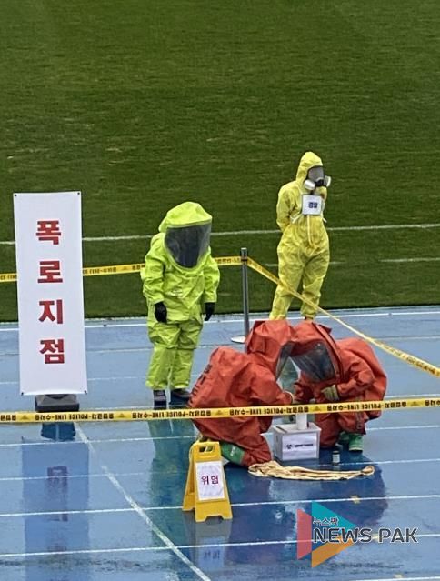 뉴스팍 배상미 기자 | 수원시 장안구보건소는 24일 수원종합운동장에서 수원장안경찰서, 수원소방서 등 유관기관과 함께 ‘2025년 생물테러 대응 대규모 합동훈련’을 했다.