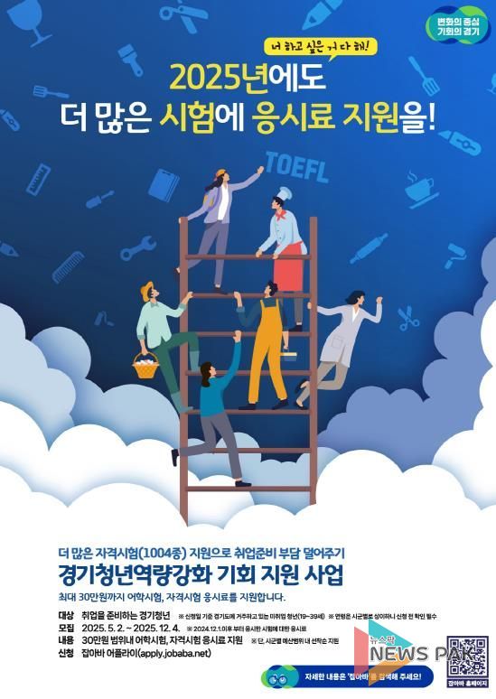 뉴스팍 배상미 기자 | 경기도가 미취업 청년의 취업 준비 부담을 줄이기 위해 어학·자격시험 응시료를 최대 30만 원까지 지원하는 ‘경기청년 역량강화 기회지원’ 사업의 참여자를 13일부터 추가 모집한다.