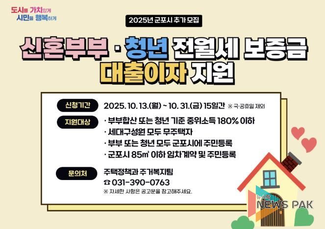 뉴스팍 배상미 기자 | 군포시는 신혼부부와 청년들의 주거비 부담 경감과 안정적인 거주환경을 위해 추진 중인 ‘군포시 신혼부부 및 청년 전월세 보증금 대출이자 지원사업’의 지원 기준을 대폭 완화하고 이에 따라 추가 지원 대상자를 모집한다고 밝혔다.