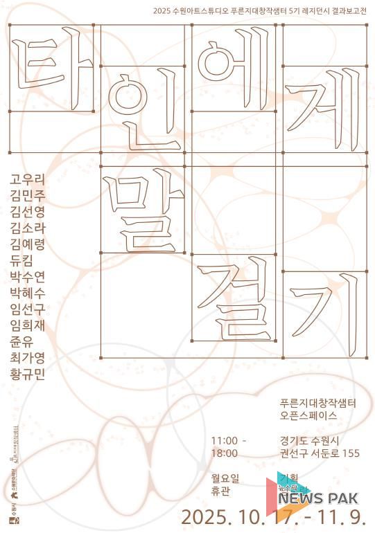 뉴스팍 배상미 기자 | 수원문화재단은 오는 10월 17일부터 11월 9일까지 약 3주간 탑동 시민농장에 자리한 수원아트스튜디오 푸른지대창작샘터에서 5기 레지던시 참여작가 13인의 올 한 해 작품 활동 성과를 공유하는 결과보고전 '타인에게 말 걸기'를 개최한다.