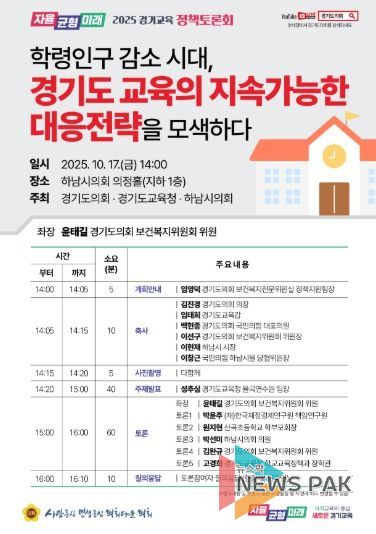 뉴스팍 배상미 기자 | 경기도의회 보건복지위원회 윤태길 의원(국민의힘, 하남1)은 오는 10월 17일 오후 2시, 하남시의회 의정홀(지하 1층)에서 '학령인구 감소 시대, 경기도 교육의 지속가능한 대응전략을 모색하다'를 주제로 정책토론회를 개최한다.