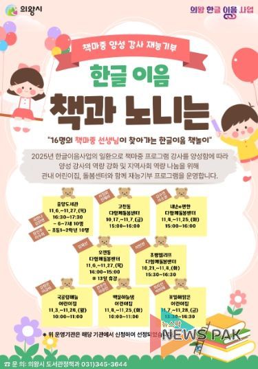 뉴스팍 배상미 기자 | 의왕시는 '한글 이음 사업'의 일환으로 민관학이 협력하는 ‘찾아가는 도서관 책마중 프로그램’을 활발히 추진하고 있다고 밝혔다.