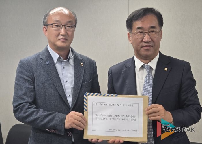 뉴스팍 배상미 기자 | 경기도의회 건설교통위원회 김동영 부위원장(더불어민주당, 남양주 오남)은 20일 경기도청 율곡홀에서 열린 2025년 국회 국토교통위원회 국정감사 현장을 찾아, 국회 국토교통위원회 맹성규 위원장에게 '도시교통정비 촉진법 시행령' 개정 촉구 건의안과 '건설산업기본법' 개정 촉구 건의안 등 경기도의회가 의결한 두 건의 건의안을 전달했다.