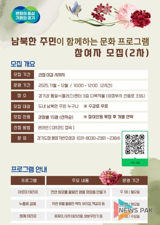 뉴스팍 배상미 기자 | 경기도는 10월 22일부터 ‘남북한 주민이 함께하는 문화 체험 프로그램’ 참여자를 모집한다.