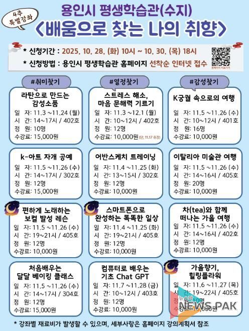 뉴스팍 배상미 기자 | 용인특례시는 수지에 위치한 용인시 평생학습관에서 28일부터 30일까지 특별강좌 교육프로그램 수강생을 모집한다고 22일 밝혔다.