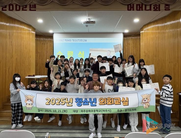 뉴스팍 배상미 기자 | 경기도의회 건설교통위원회 안명규 의원(국민의힘, 파주5)은 10월 21일 파주송화초등학교 시청각실에서 열린 ‘제36회 청소년의회교실’에 참석해 파주 송화초등학교 학생들과 함께 모의의회를 체험하며 민주주의의 가치와 의회의 역할을 함께 나누는 뜻깊은 시간을 가졌다.