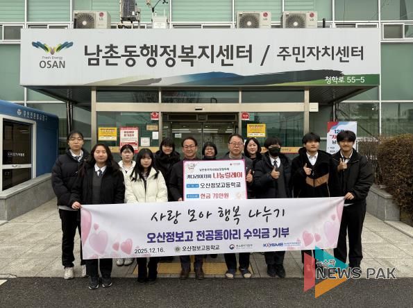 뉴스팍 이소율 기자 | 오산시 남촌동행정복지센터는 지난 16일 오산정보고등학교 전공동아리 학생들과 주훈지 교장, 담당교사 등이 참석한 가운데 관내 저소득층 지원을 위한 바자회 판매 수익금 70만 원을 기탁받았다고 밝혔다.