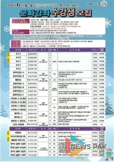 뉴스팍 배상미 기자 | 고양특례시 일산동구 풍산동 주민자치회가 오는 22일부터 2026년 1분기 주민자치센터 문화강좌 수강생을 모집한다고 밝혔다.