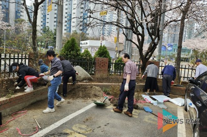 뉴스팍 배상미 기자 | 수원시 장안구 정자2동 기로경로당은 지난 1일, 봄을 맞아 어르신들이 직접 경로당 화단을 정리하고 꽃과 나무를 심었다.