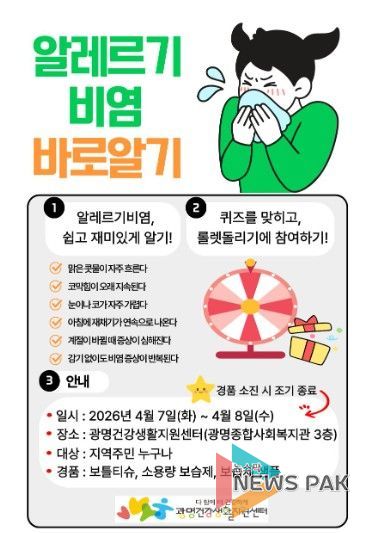 뉴스팍 배상미 기자 | 광명시는 시민 알레르기 질환에 대한 인식을 높이고 예방관리를 돕기 위해 오는 7일부터 8일까지 이틀간 ‘아토피·천식 예방관리사업 홍보부스’를 운영한다.