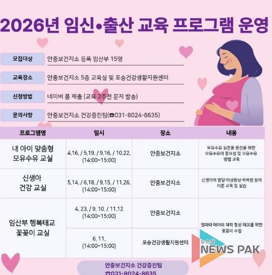 뉴스팍 이소율 기자 | 평택시 안중보건지소는 관내 임산부들의 건강한 출산을 돕고 체계적인 육아 정보를 제공하기 위해 ‘2026년 임신․출산 교육 프로그램’을 본격 운영한다고 밝혔다.
