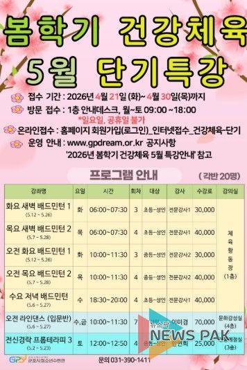 뉴스팍 배상미 기자 | (재)군포시청소년재단 군포시청소년수련관은 ‘2026년 봄학기 5월 단기특강 프로그램’을 운영하고 한다고 밝혔다.