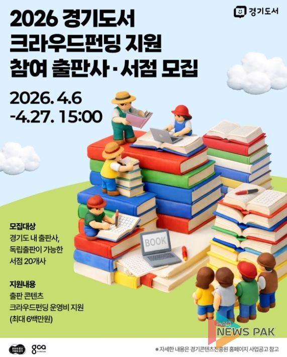 뉴스팍 배상미 기자 | 경기도는 도내 출판 생태계 활성화와 유통 다각화를 위해 ‘2026 경기도서 크라우드 펀딩 지원사업’에 참가할 출판사와 서점을 오는 27일까지 모집한다.
