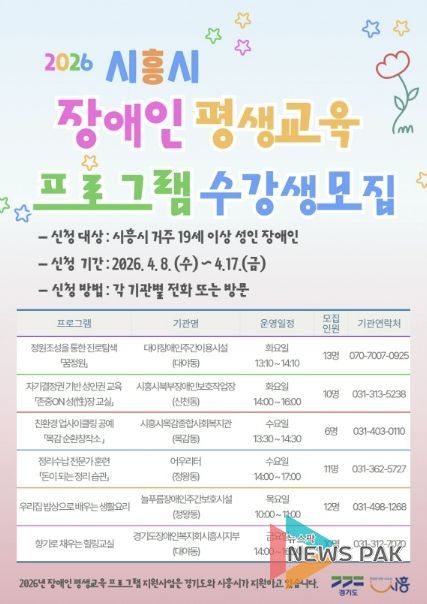 뉴스팍 배상미 기자 | 시흥시가 관내 성인 장애인의 학습권 보장과 사회참여 확대를 위해 ‘2026년 장애인 평생교육 프로그램 지원사업’을 본격적으로 시작하며, 4월 8일부터 17일까지 프로그램 운영을 위한 학습자를 모집한다.