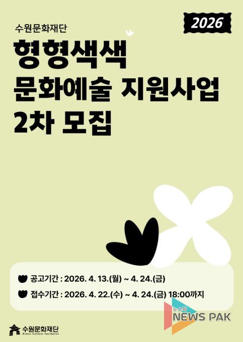 뉴스팍 배상미 기자 | 수원문화재단은 지역 예술인의 창작활동을 지원하고 시민의 문화 향유 기회를 확대하기 위해 이달 13일부터‘형형색색 문화예술지원사업’ 2차 공모를 추진한다.