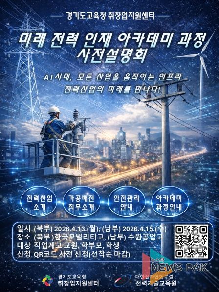 뉴스팍 배상미 기자 | 경기도교육청이 오는 13일과 15일 양일간 도내 직업계고 학생의 전력산업 분야 진로 탐색과 취업 역량 강화를 위한 ‘미래 전력 인재 아카데미 과정 사전설명회’를 개최한다.