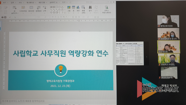 뉴스팍 이지율 기자 | 경기도평택교육지원청은 12월 23일 관내 사립학교 중·고·특수 사무직원 50명을 대상으로 ‘2021년 사립학교 사무직원 역량 강화 연수’를 실시했다.