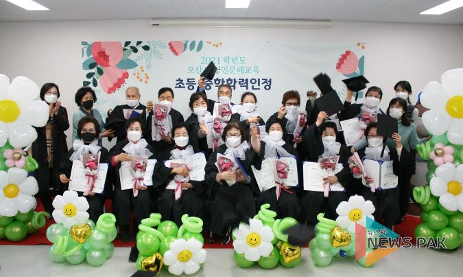 뉴스팍 이지율 기자 | 오산시는 16일 오산시평생학습관에서 2021학년도 오산백년한글학교 성인문해교육 초등.중학학력인정 졸업식을 개최했다고 전했다.