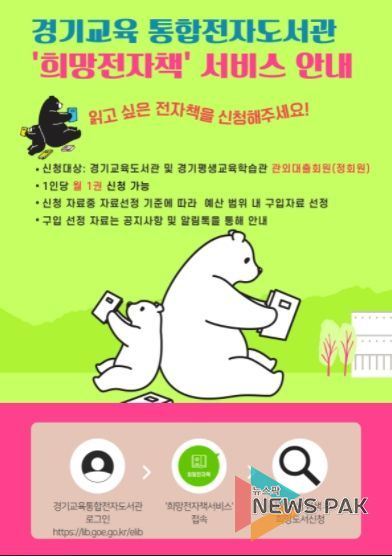 뉴스팍 이지율 기자 | 경기중앙교육도서관이 도내 경기교육도서관 10개 관과 경기평생교육학습관 정회원을 대상으로 ‘희망전자책 서비스’를 운영한다고 28일 밝혔다.