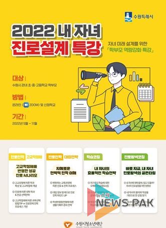 뉴스팍 이지율 기자 | 수원시청소년재단(이사장 송영완) 청소년희망등대는 수원시 관내 초·중·고등학생 자녀를 둔 학부모 대상으로 하는 ‘내 자녀 진로설계 특강’에 참가할 학교를 4월 5일부터 모집한다.