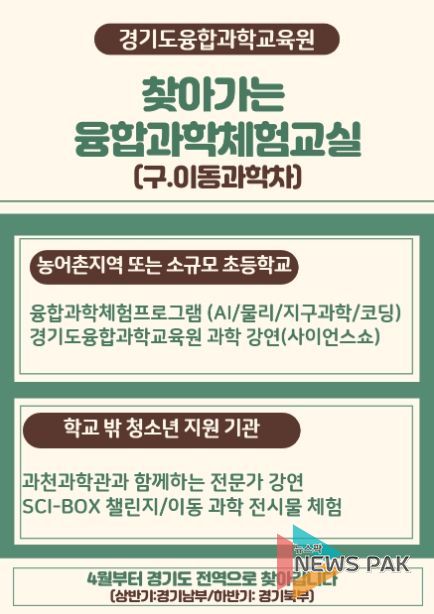 뉴스팍 이지율 기자 | 경기도융합과학교육원(원장 이태헌)은 경기남부 지역 농어촌지역과 소규모학교 초등학생, 그리고 도내 학교 밖 청소년을 대상으로 4월부터 ‘찾아가는 융합과학체험교실’을 운영한다.