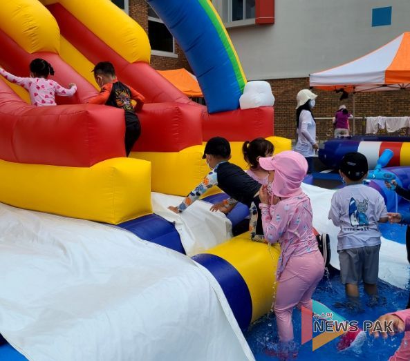 유아들이 더위를 잊고 친구와의 즐거운 추억을 쌓을 수 있도록 유치원의 실외 공간에는 무지개 워터 슬라이드, 미니 워터 슬라이드, 대형 풀장 등 다양한 물놀이 체험활동 기구가 배치하였다.