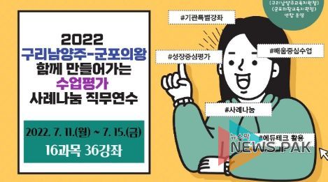 뉴스팍 이지율 기자 | 경기도구리남양주교육지원청은 경기도군포의왕교육지원청과 연합하여 구리남양주와 군포의왕 지역의 희망 교사 대상으로 2022년 7월 11일(월)부터 7월 15일(금)까지 5일간 ‘2022 함께 만들어가는 수업평가 사례나눔 직무연수(16과목 36강좌)’를 실시한다.