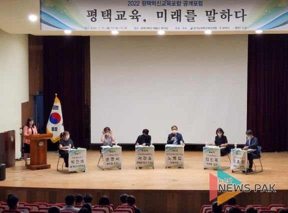 뉴스팍 이지율 기자 | 경기도평택교육지원청과 평택시청, 평택시의회는 11일 평택대학교 예술관 음악당에서‘평택교육, 미래를 말하다’라는 주제로 포럼 위원, 교원, 마을교육활동가 등 120여 명을 대상으로 2022 평택혁신교육포럼 공개포럼을 개최하였다.